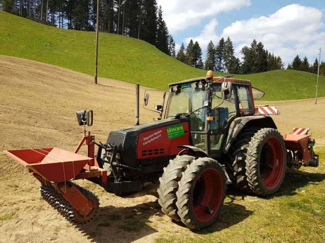 EIne Eigenkonstruktion erlaubt es uns Drill und Flächensaat zu kombinieren d.H. das Saatgut in verschiedenen Tiefen abzulegen, um ein optimales Auflaufen, bei Nässe und Trockenheit zu gewährleisten.